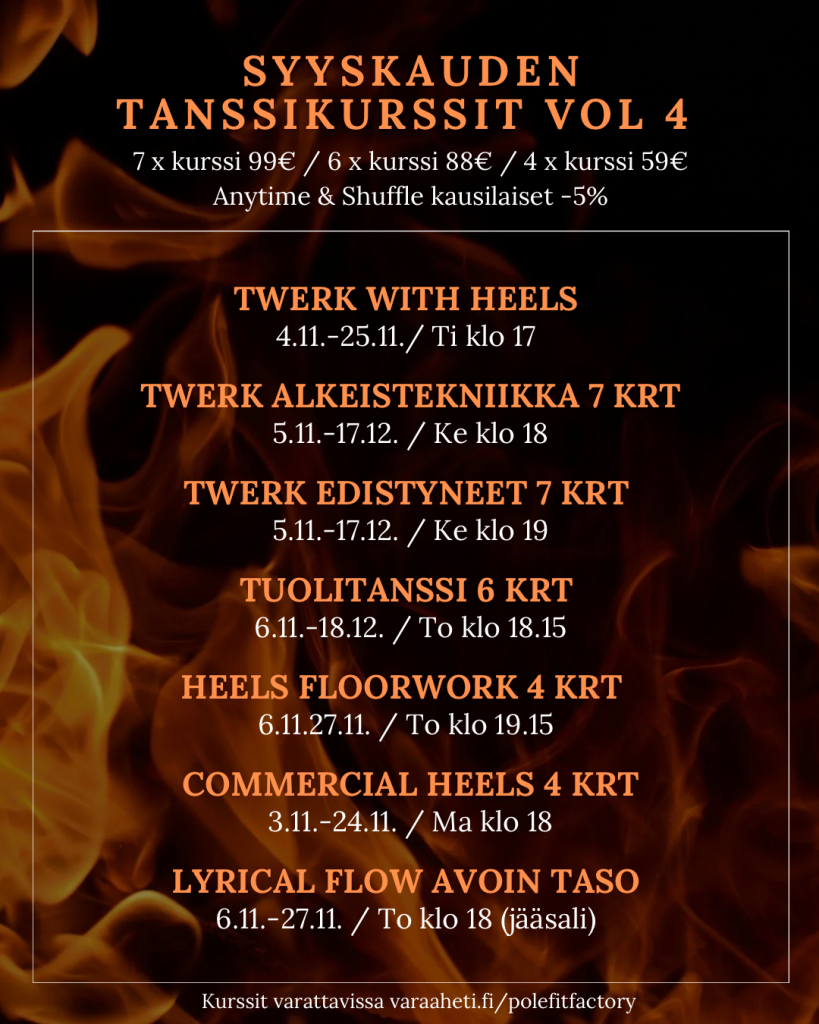 Kokonaiset kurssit ovat myynnissä edeltävään päivään kurssin aloituksesta, jonka jälkeen mahdolliset jäljelle jääneet paikat löydät varausjärjestelmästä varattavana kerta- ja sarjakorteille. Edullisimmin ja varmimmin tanssit/treenaat ostamalla koko kurssin kerralla.